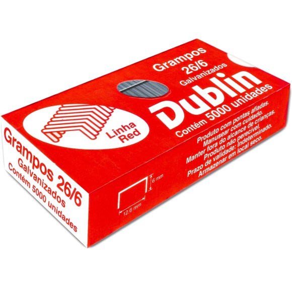 O Grampo 26/6 Galvanizado da Dublin é fabricado com arame de aço revestido resistente à oxidação. Caixa com 5000 grampos.
